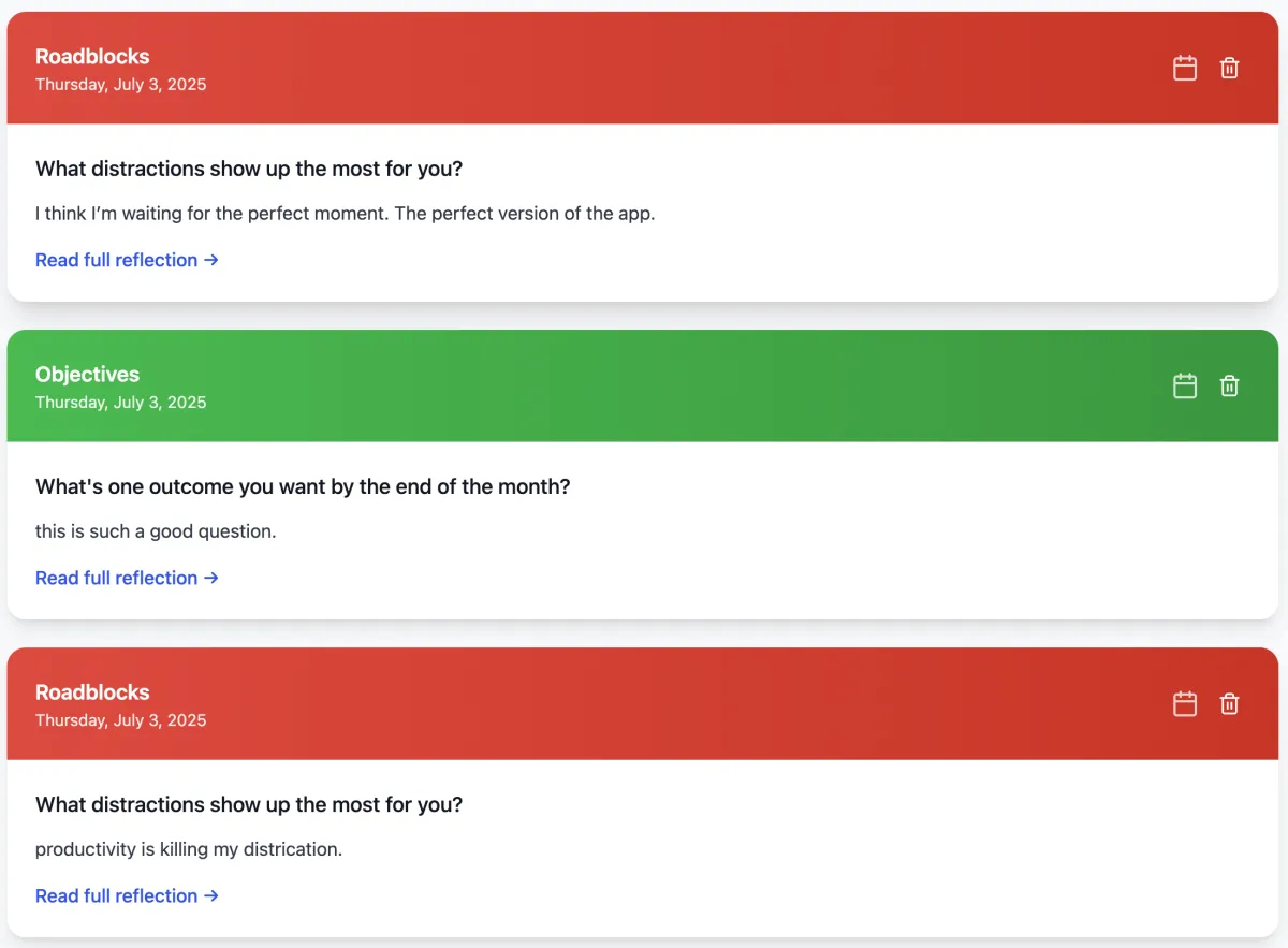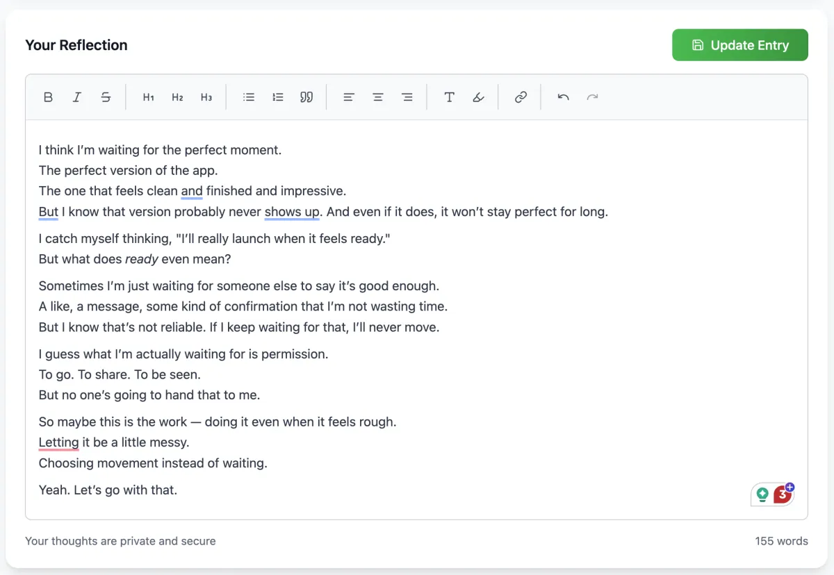 See how often you’re showing up. Your dashboard shows total entries, your weekly activity, and your current streak — a simple way to stay motivated.