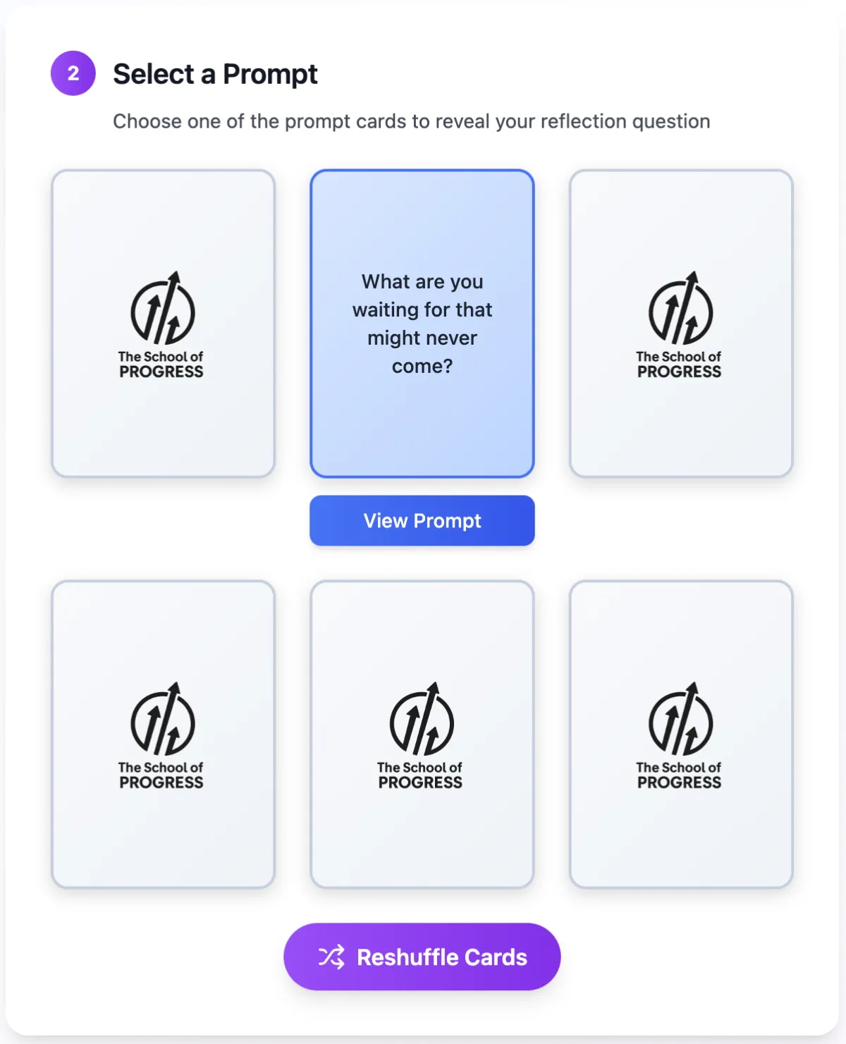 Start your journaling session by spinning a wheel to focus on one of eight key areas in the PROGRESS Framework — like goals, roadblocks, or motivation. No need to decide what to write about. Just spin and begin.
